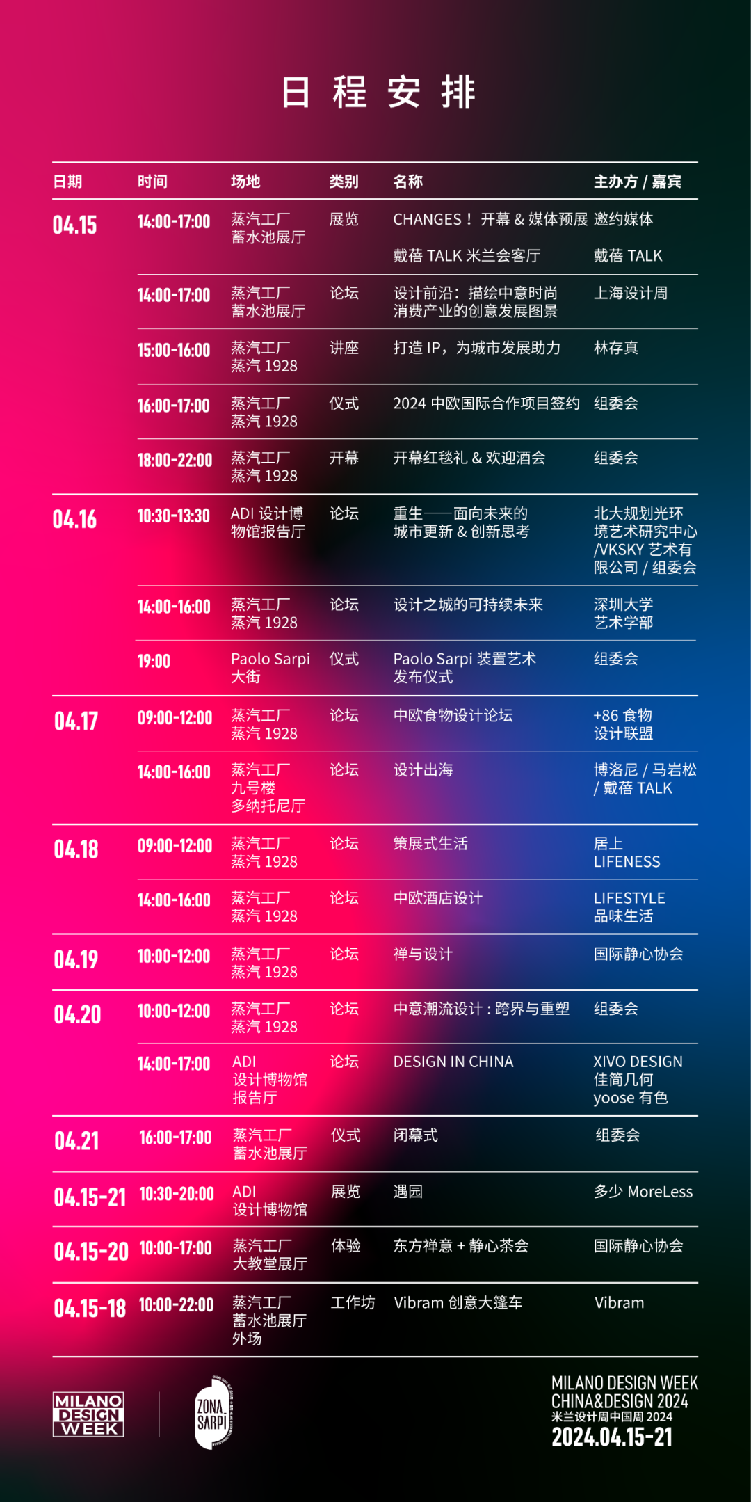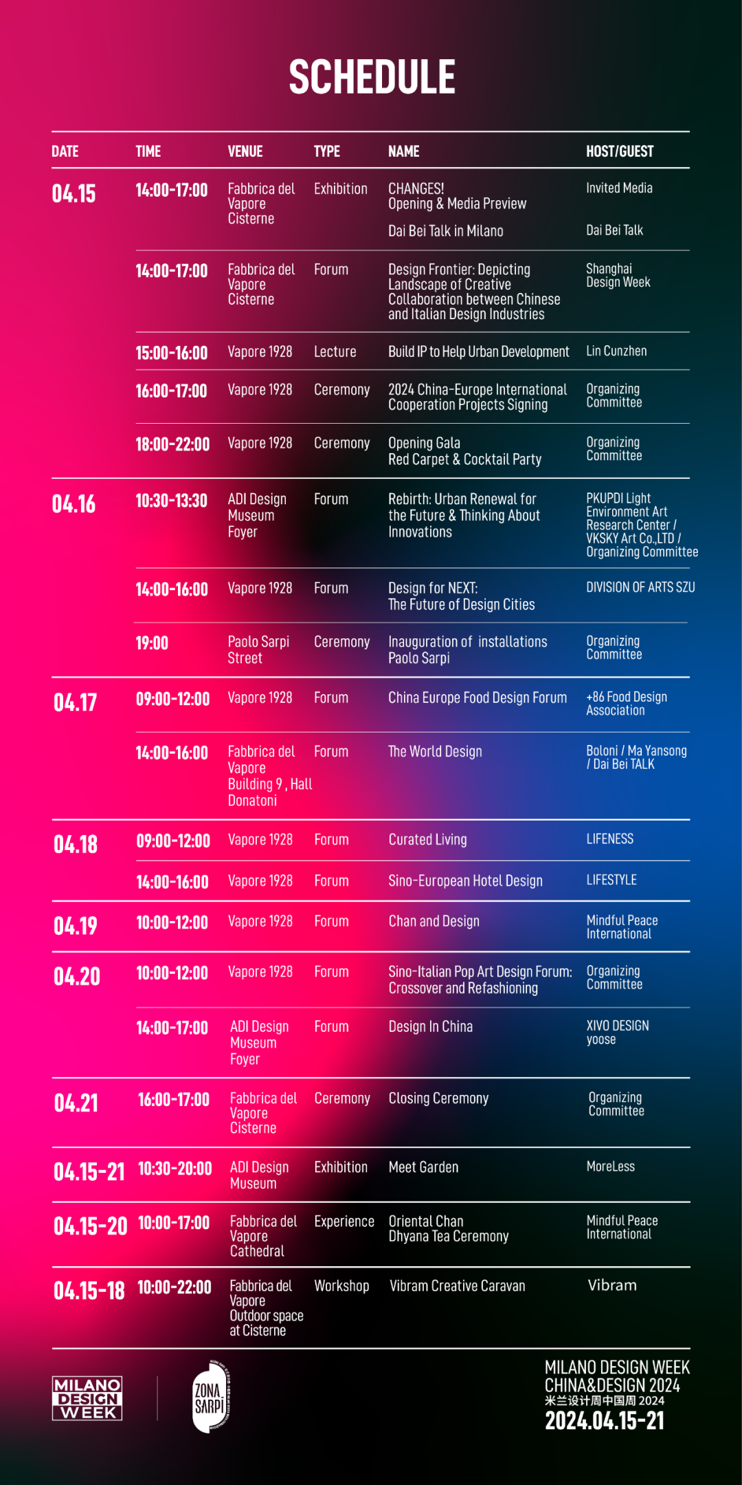 4月15日,米兰设计周·中国周活动正式拉开帷幕。活动以「百年华人街、精彩中国潮」为主题,通过近百场展览、展示、发布活动,将蒸汽工厂展区(原米兰有轨电车厂)、ADI意大利设计博物馆以及保罗萨比街区进行有机结合,成为2024米兰设计周场外展最新亮点。 米兰设计周·中国周活动,在中国驻意大利大使馆文化处、中国驻米兰总领事馆的支持下,由北京、上海、深圳、成都、海南等城市设计周以及意大利中国商会、WDW(世界设计周城市网络)、ICOD(国际设计理事会)、米兰华夏集团、北京工信国际、北京工业设计促进会等机构联合发起,米兰中国设计中心主办、北京国际设计周联合主办。 当地时间4月15日晚7点,米兰设计周·中国周开幕红毯礼暨欢迎酒会在蒸汽工厂举行,来自米兰大区政府、市政府、中国驻意大利大使馆、中资企业、华人华侨代表、二十多所国际设计院校代表以及法国巴黎设计周代表、开幕酒会官方合作路特斯的代表等近200位嘉宾参加了当天的开幕活动。 欢迎酒会上,发起人MICHELE介绍了2024米兰设计周·中国周活动基本情况。他说,蒸汽工厂是此次活动的核心展区,以「CHANGES!」为主题的展览,吸引了65个品牌、7所中意大学、几十个各类设计项目的参与。北京(通州)、无锡作为今年的伙伴城市,分别带来了中国最具代表性的城市和生态有机更新案例;非常感谢国际静心协会,在主会场大教堂,以「静心茶会」为主题,准备了12场禅茶体验活动,并将以「AI时代禅与设计」为主题举行米兰设计对话活动,更是吸引了设计同行的高度关注。ADI博物馆是此次活动的另一个展区,这里在将呈现中国周年度设计师侯正光先生的作品。 米兰设计周·中国周发起人 Michele Brunello 保罗萨比街区,无疑是2024米兰设计周场外展最大的关注点,组委会认为,在纪念华人街一百年的同时,我们要把展望与合作的任务交给年轻人,因此,在这条街上,我们看到中意两国小朋友共同创作的牌坊装置Noi-Men(我们的门),北京国际儿童设计创新系列活动带来的儿童装置,组委会与当地华人华侨共同举办了数十场活动以及橱窗设计大赛。特别是来自北京的「一年一字、龙年汉字」项目,将为米兰中国文化中心学习汉语的小朋友赠送200套龙字拼图。 意大利众议员前任欧盟委员会副主席、国会议员马丽娜·贝林格丽(Marina Berlinghieri) 意大利众议员前任欧盟委员会副主席、国会议员马丽娜·贝林格丽(Marina Berlinghieri)在致辞中表示, 2024年意大利政府启动为期三年的纪念马可波罗去世700周年的活动,2024中意合作的ZonaSarpi(中国周)落地百年华人街。历史证明,文化交流和经贸往来彼此助力、彼此尊重、相互借鉴、共同发展才能推动历史的良性循环。 中国驻意大利大使馆公参 周西松 中国驻意大利大使馆公参周西松表示,「米兰设计周」是全球起步最早、规模最大、影响最广的国际设计盛会,是现代设计的「奥林匹克」。感谢米兰市政府的支持,感谢发起机构过去半年来的努力,感谢近百个品牌、机构的热情参与。相信通过各方努力,中国周不仅能成为中国设计海外推广、集体发声的专业平台,也能成为服务在地用户、参与在地创新、促进经贸合作的共同平台。 意大利中国商会秘书长 范显伟 意大利中国商会秘书长范显伟表示,从2023年中国日到2024年中国周,以米兰中国设计中心为核心的中意两国创意设计人士,为此付出了巨大的努力,也感谢意大利中国商会会长单位中兴集团的大力支持。米兰是重要的设计之都、也是时尚之都,希望米兰中国中心,能更好地发挥桥梁作用,为中国品牌走出国门、融入市场,提供更多的文化助力。 中国工业设计协会特邀副会长陈冬亮表示,2024米兰设计周·中国周的成功举办,标志着新时代背景下,中国设计品牌出海找到了新的路径和方式。在国际知名的成熟设计盛会上建构中国板块,是中国设计融入世界语境的重要一步。以中国最前沿的设计潮流,结合在地华人社群的创意力量,更好地促进社区融合与城市有机更新,将成为中国周项目持续发展的核心方法论指导。 开幕酒会官方合作伙伴路特斯集团副总裁姚映佳说,设计也在全球化的进程中不断演进。刚刚获得红点大奖的路特斯自行车就是英国品牌、国际设计、意大利制造的产物。作为英国的自行车品牌,我们努力赋予它更现代的活力、更时尚元素,米兰设计周给了我们很大的启发。六月底,在环法首发站佛罗伦萨,我们将提出「New Grand-Tour with LOTUS」计划,让新一代年轻人,能通过骑行,去观察意大利经典的美、现代的美、可持续的美。 米兰华夏集团董事长 周小燕 米兰华夏集团董事长周小燕表示,米兰设计周·中国周活动,以百年华人街为背景,以城市有机更新与人文融合为目标,以中意的创新创意力量为抓手,这是极富新意与建设性的新举措。过去一百年来,以温州侨民为主体的华人社会,参与见证了华人街的变化,深知文化交流对于与当地社会建立互信的重要意义。华人街的商户、住户是中国周最大的受益者,华人华侨将继续大力支持这项活动,以未来百年融合发展为愿景,集合国际智慧,共同把米兰华人街打造成米兰最具「中国底色、亚洲特色」的国际设计街区。 无锡文旅集团总裁 邱亚君 无锡蠡湖生态设计节发起人许赟代表设计节组委会赠送伙伴国家赠礼并合影 开幕酒会上,无锡文旅集团总裁邱亚君与意大利众议