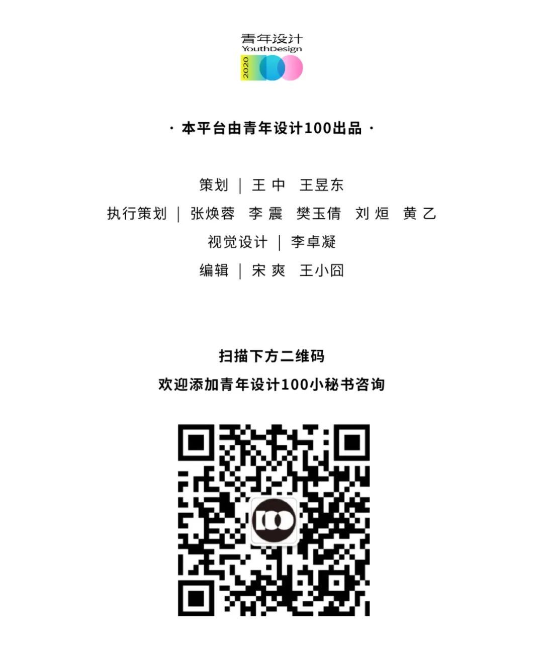“青年设计100”是由北京国际设计周、珠海国际设计周、中央美术学院城市设计学院于2019年联合发起的一项青年设计师培养计划。该计划联合全球一批重要的设计艺术院校,汇聚各领域思想家和研究者,通过导师推荐、专家筛选、公众评议、市场检验等多重方式,挖掘思想活跃、理念超前、学术扎实、具备潜力的青年设计师,为他们提供实践、展示、学习的机会,搭建走向世界的桥梁。