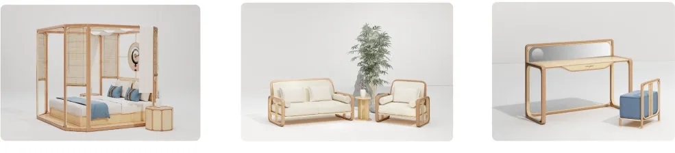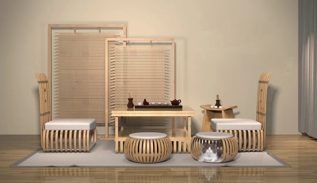 整套家具利用竹的柔韧性,以竹笼为外形特点来构建。集合了现代产品多样性,把家具和宠物及储物空间结合起来,营造出简洁、舒适、雅致的氛围。