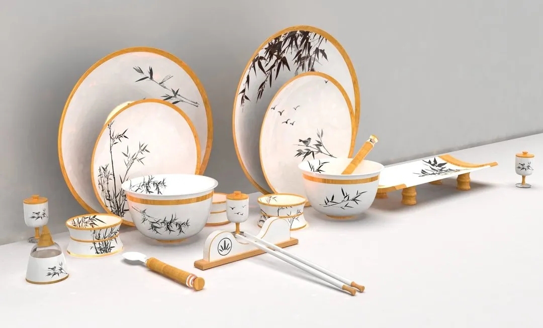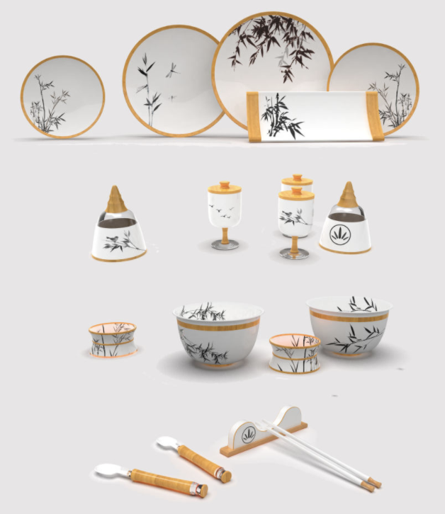 以竹林山水为主题,用竹木,陶瓷及透明的玻璃相结合,其中陶瓷器中的手绘山水和竹木材质的运用恰到好处,用餐具时领略竹子的君子节气,又能欣赏到传统的山水画,品味中华文化的博大精深。