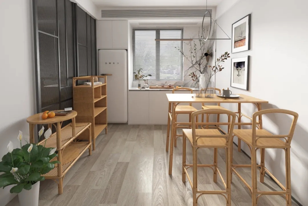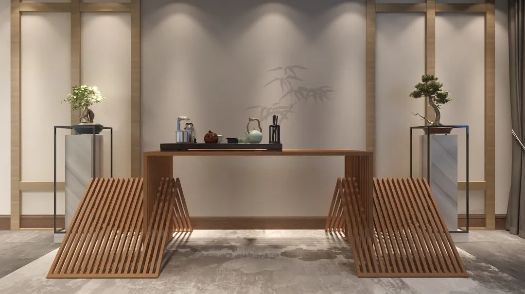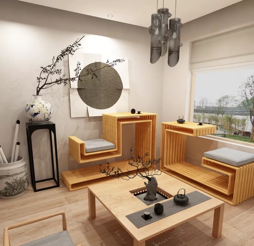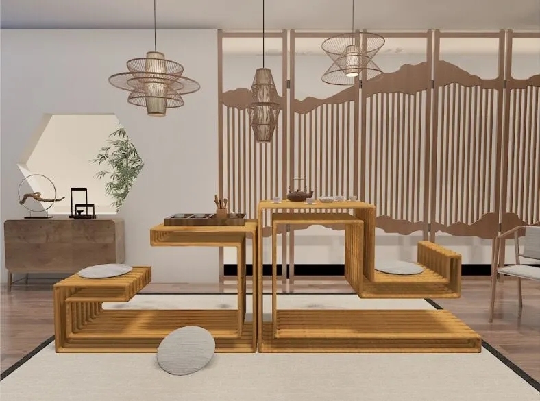 以简洁的新中式设计书写空间的清雅气韵,兼顾功能与审美需求。全套家具结合木材、竹、竹编,予人舒适的休憩体验与别致的视觉享受。