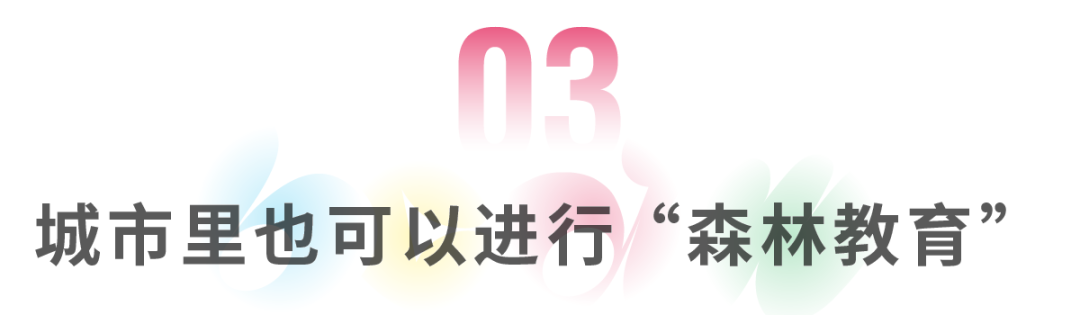 森林具有公认的疗愈效果,日本有“Shinrin-yoku”[森林浴]的传统,六十多个森林疗愈中心和专门设计的森林疗愈步道遍布日本。对于生活在城市中的儿童来说,森林不仅可以帮助孩子们增强体魄增进福祉,更是绝佳的教育基地,对儿童的全面发展有着积极的作用。