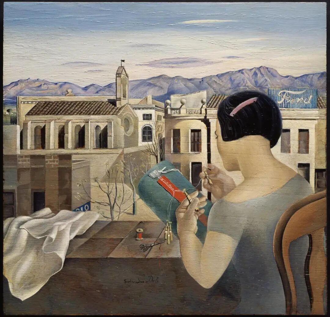 我们从画家家里的阳台可以看到前景中有一个女孩儿,她拥有1920年代的时尚发型,而在背景中我们可以看到菲格拉斯教堂和一些建筑物。