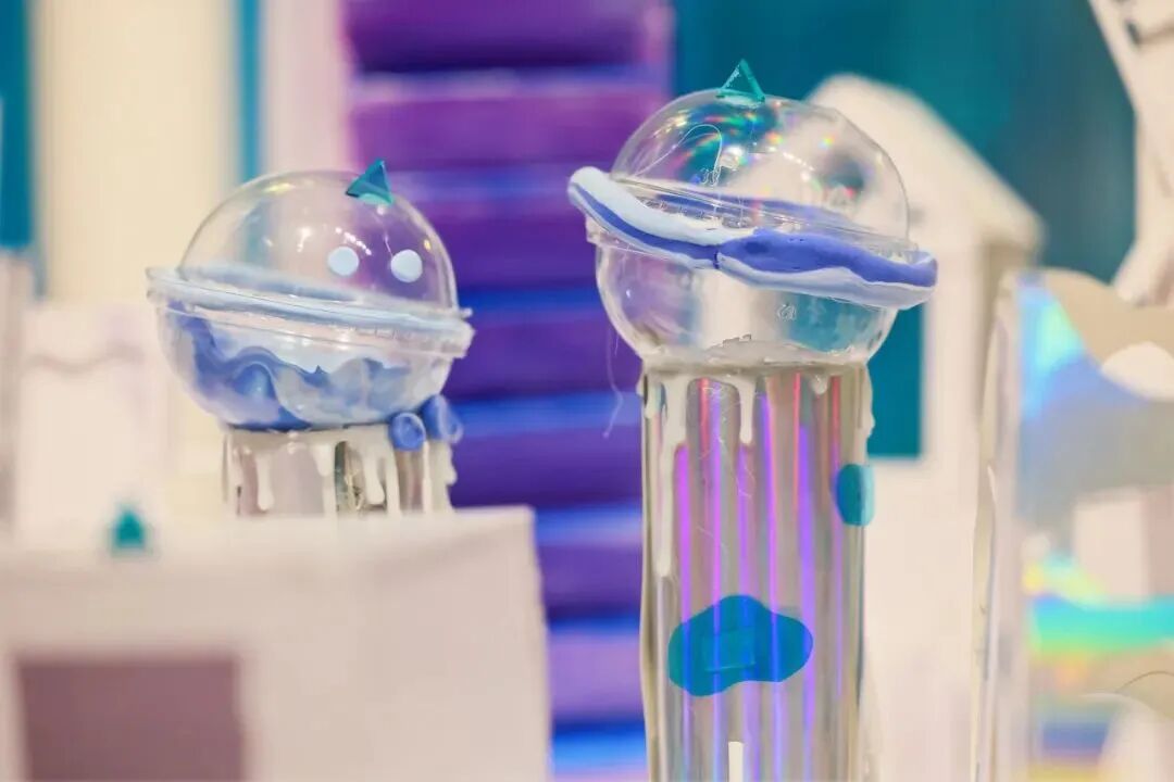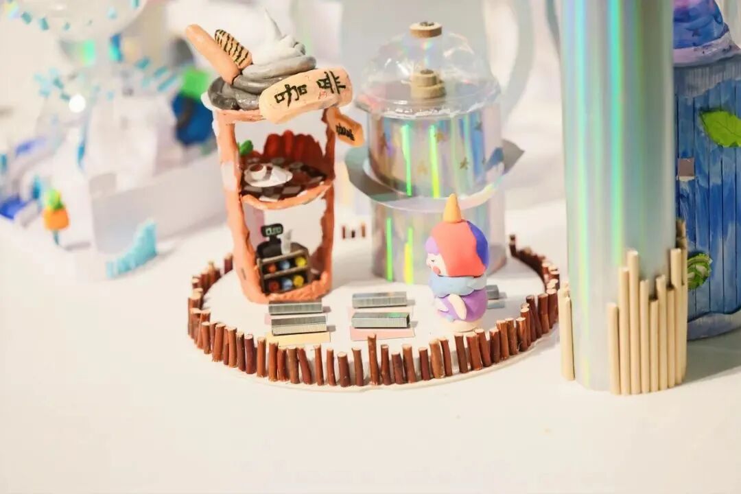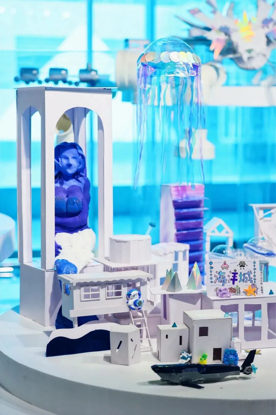 最后装置的呈现主要是孩子们设计的未来建筑、未来交通工具内容,装置底板是错落有致的圆形岛屿,底下是交错贯穿的底下管道,这些部分由老师和孩子共同协作搭建完成。最终这个具有科技感和创造力的作品凝结了孩子们的创想和心血得以实现,这正是朝着未来奔赴的我们!