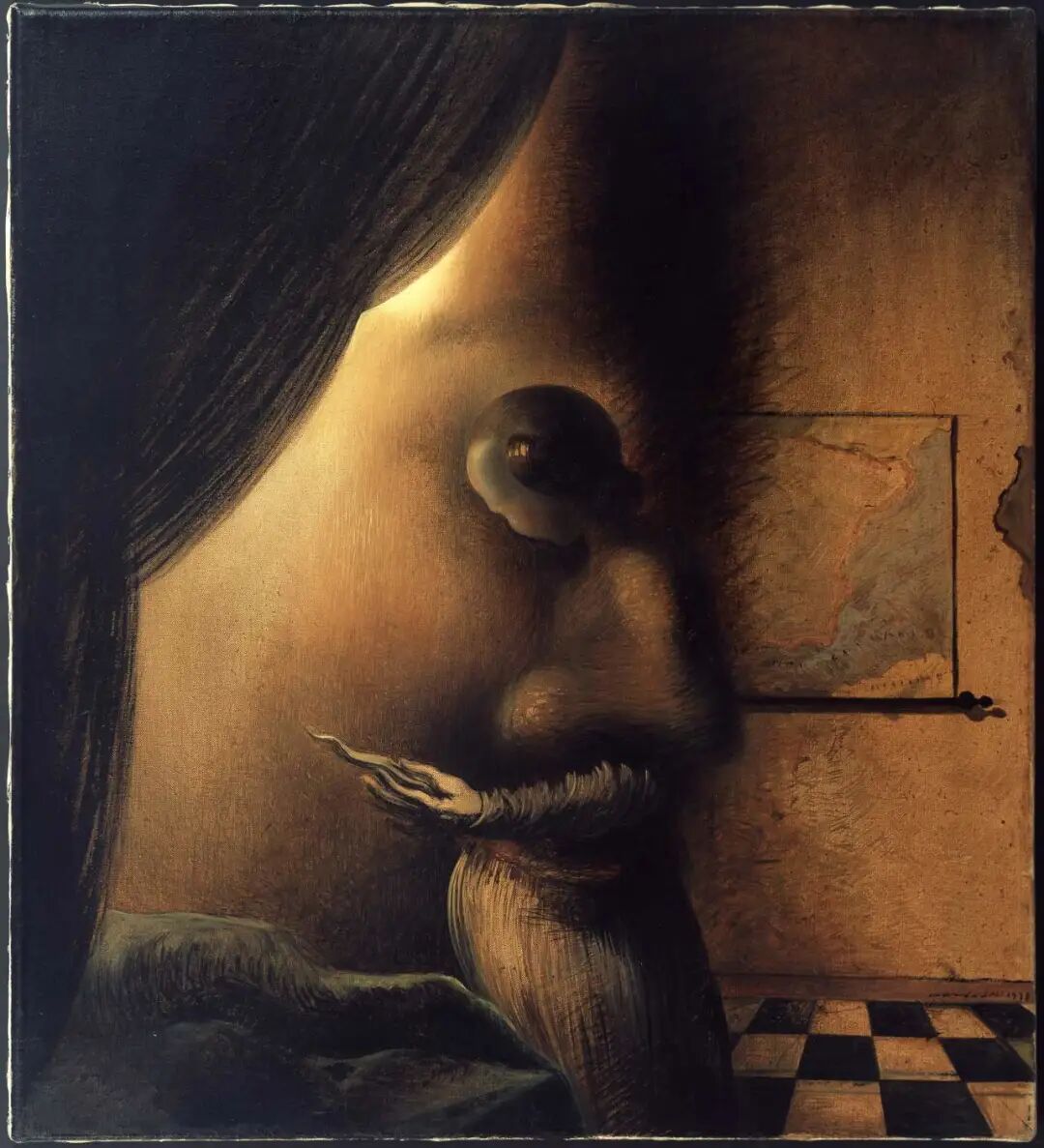 一幅具有巨大象征意义和图像的作品。在夜间景观中,达利放入了多种令人不安的联系和成分。达利想象中的重要元素有柔软的时钟、卡达克斯和克雷乌斯角的岩石、柔软的形状、额头上开着抽屉的人物、一条面包以及钢琴。除此之外,还必须强调被拟人化的毛茸窗帘。达利在这幅场景作品中通过明显不相关的想法的堆积最终让它们和谐共处。中心人物似乎来自戏剧或芭蕾舞蹈,中心人物的左手边是一块高大的岩石,而在她的右边则是一个令人不安的立方体建筑和一个拟人化的扶手椅。