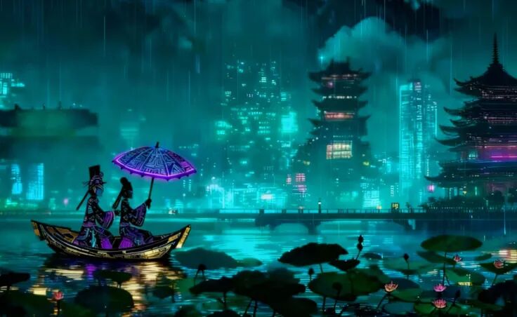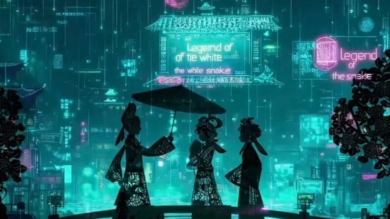 作品简介:本作品《赛博白蛇传》以国家级非物质文化遗产——河北皮影戏为核心,展开一场深度的非遗数字化实践。作品将经典剧目《白蛇传》的叙事脉络与赛博朋克美学相融合,构建出一幅具有未来感的非遗活化图景。在视觉表达上,作品严格保留了皮影戏非遗技艺的核心特征——镂空雕刻的线条语言与二维平面的戏剧表达,同时赋予其机械结构与霓虹光影的赛博质感。通过数字技术的反复调试,在保留皮影独特肌理的同时,实现了传统工艺与未来美学的视觉平衡。