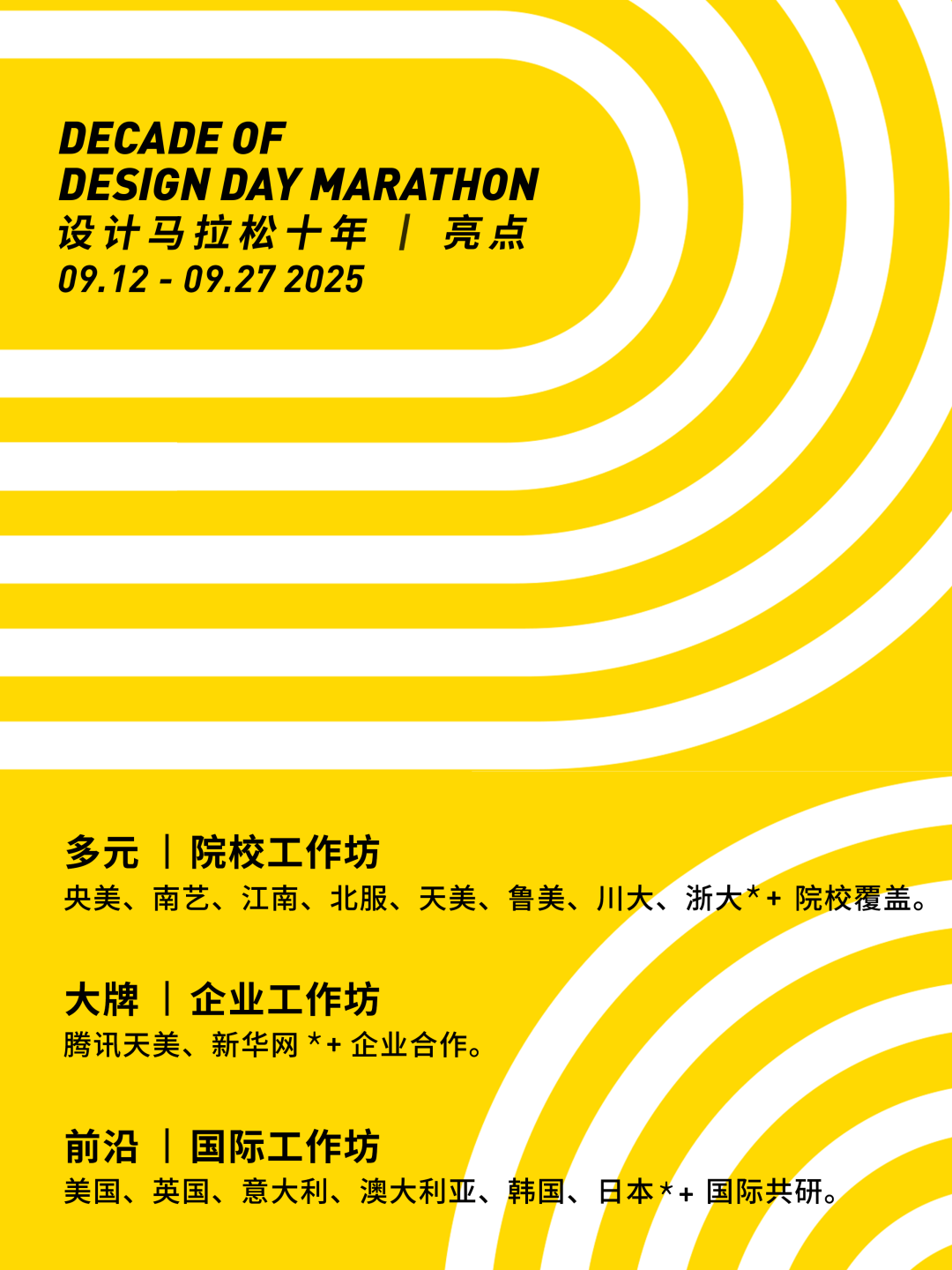 十年耕耘,十年共创。设计马拉松迎来十周年里程碑,从2016到2025年间成功汇聚全球400+高校、上万名青年设计师,让“设计马拉松”真正跑成了一条连接教育、产业与社会的创意赛道。感谢各位十年并肩支持,把“马拉松”跑成了北京国际设计周最常青的学术活动。 此刻,站在新的起点,我们回顾过去两周来自全球的参与者围绕“文脉传承下的新质生产力”展开的思维碰撞与精彩实践,也满怀信心地展望下一个十年。