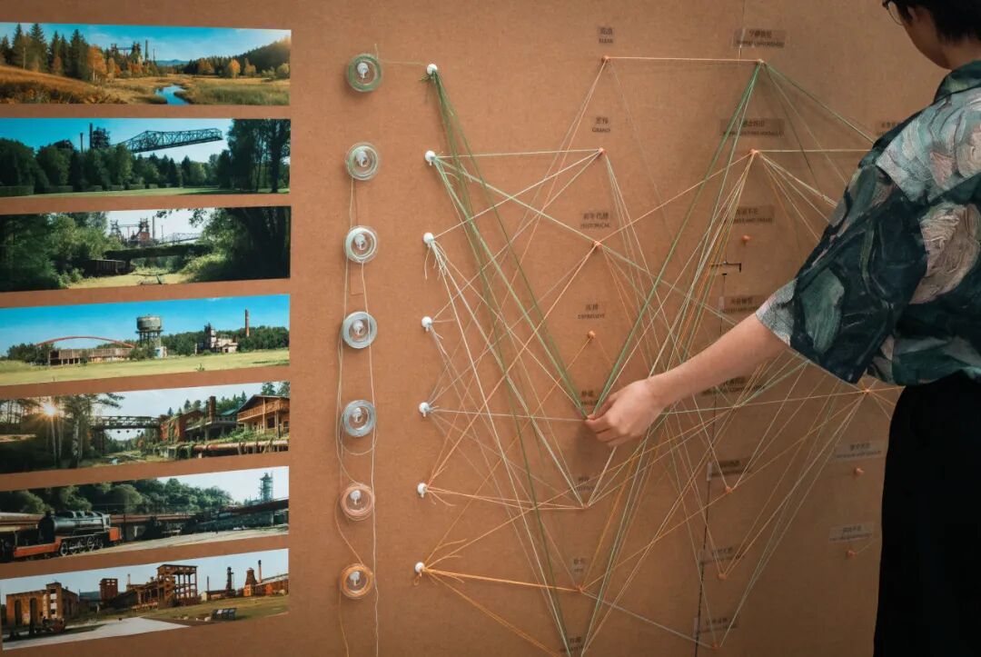 设置互动环节,邀请观众以棉线为媒介,在展板上穿引表达认知与情感,共同编织一幅承载集体记忆的工业图景。