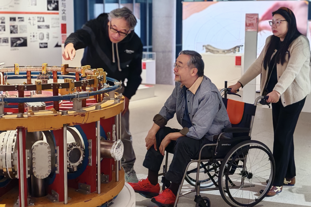 李建刚院士与中央美术学院党委书记徐扬、中央美术学院院长林茂会面,在展览中介绍托卡马克装置