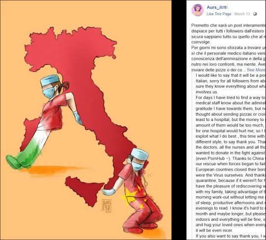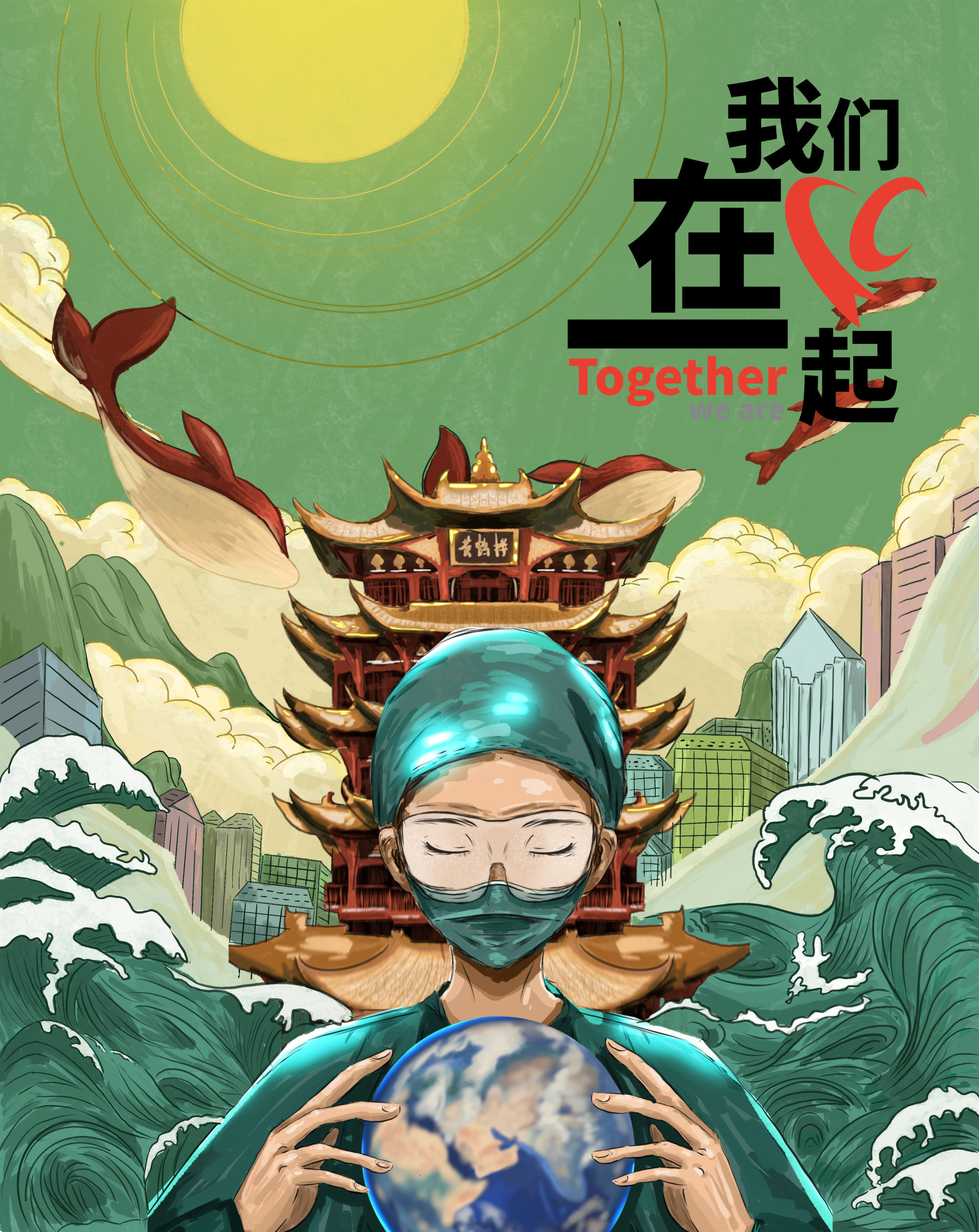 作者奥罗拉(Aurora Cantone)是一位18岁的意大利女孩,目前就读于那不勒斯的一所高中,对绘画有着极大的兴趣。听闻“我们在一起”2020抗击“新冠肺炎”全球招贴设计公益征集活动,作者本人及其父母均同意参与本次全球公益征集活动,希望通过作品表达对前往支援意大利的中国朋友以及在抗疫前线奋斗的医务人员的感谢,也希望通过公益传播活动在遥远的中国与更多的人一起分享。同时外交部新闻司司长华春莹也在推特上转发了这幅作品,并表示“中、意在一起”。
