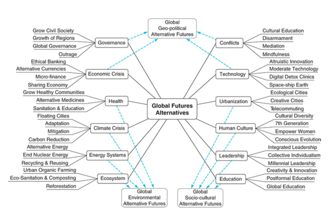 多种对抗趋势和克服挑战的替代全球环境、地缘政治和社会文化未来框架,Jennifer M. Gidley (2017)